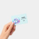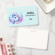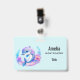 Name badge with an adorable illustration. A blue and purple dolphin surrounded by pretty colourful underwater plants.