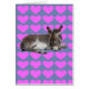 Cute little chocolate coloured baby donkey foal sleeping on a blue background with pink hearts. Inside of card has two pink hearts. Card is blank for your own message.