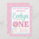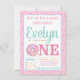 Doughnut first birthday party invitations with cute pink sprinkle doughnut and sprinkle background. This doughnut birthday party invitation is easily customised for your event by adding your details.