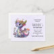 Birthday invitation postcard with an illustration of a mythical dragon. Purple and blue scales. A flowered gold crown with horns adorns its head. Magical, fun and friendly.