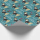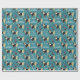An adorable black and tan pug wears a tuxedo jacket on this cute birthday wrapping paper. Beside him are images of a moustache, a pair of eyeglasses, a pipe, and a red heart. The white text says "All dressed up to wish you a Happy Birthday". The images and the text are placed on a teal green background.