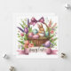 A wicker basket adorned with colourful decorated eggs and a cute brown bunny sitting inside. The basket is surrounded by vibrant spring flowers such as tulips, lavender, and other blossoms, creating a cheerful and festive atmosphere. A pink ribbon with a bow decorates the basket, and a banner at the bottom reads "Happy Easter" in elegant script.