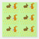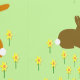 This awesome patterned wallpaper features a pair of cute little Easter bunnies surrounded by yellow daffodil flowers. The rabbits are brown with big ears, black eyes and fluffy white tails. One of the bunnies is holding an Easter egg with a pretty purple bow on it and is reaching out to offer it to the other bunny. The daffodils are yellow with a bright orange centre.