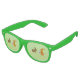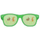 This awesome pair of party shades features a pair of cute little Easter bunnies surrounded by yellow daffodil flowers. The rabbits are brown with big ears, black eyes and fluffy white tails. One of the bunnies is holding an Easter egg with a pretty purple bow on it and is reaching out to offer it to the other bunny. The daffodils are yellow with a bright orange centre.