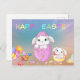 Postcard feature a cute Easter bunnies with colourful Easter eggs, on colourful background, with colourful text...Happy Easter...