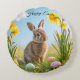 A cute brown Easter bunny with a white bow on her head sits in grass and daffodils with colourful Easter eggs scattered around her on a sunny Spring day.