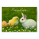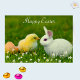 Cute white Easter bunny with chick and flowers Happy Easter Card. Text can be personalised for Easter or Birthday.