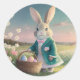 Cute Easter bunny with easter egg basket in a field of wild flowers