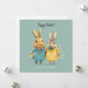 Cute Easter bunny couple holiday card. Wonderful spring colours in yellow and green / blue tones, a couple of super cute Easter bunnies in fancy clothes carrying eggs and spring flowers. Personalised text with a lovely trendy script.