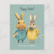 Cute Easter bunny couple postcard. Wonderful spring colours in yellow and green / blue tones, a couple of super cute Easter bunnies in fancy clothes carrying eggs and spring flowers. Personalised text with a lovely trendy script.