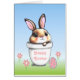 Cute Easter bunny with Easter egg and flowers Card. Text can be personalised for Easter or Birthday. Bunnies symbolise longevity, abundance and good fortune.