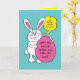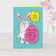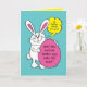 Cartoon illustration of a cute Easter Bunny holding an "eggstra" large Easter egg with a riddle on the egg. The answer is inside along with an "eggstra" special greeting. Copy can be changed.