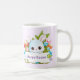 Cute Kawaii style Easter holiday mug featuring a pale blue Easter bunny with blue blowers and orange mushrooms. Easy to personalise for your younger family and friends!