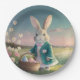 Cute Easter bunny in little blue jacket with easter egg basket in a field of wild flowers