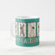 This cute teal Easter mug features cute coquette bunnies with animal print and checkerboard patterns, wearing cute hand-drawn brown bows in shades of brown and tan. Happy Easter is printed in playful type and coordinating colors underneath on both sides of the mug. The bunnies are posing against a color block of teal.