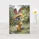 This adorable Easter greeting card features a sweet bunny wearing a cheerful yellow dress and a colorful flower crown while carrying a basket of pastel Easter eggs. Surrounded by butterflies and soft spring sunshine, the scene captures the playful magic of Eastertime. Perfect for sending warm holiday wishes to friends, family, or anyone who loves cute bunny art and whimsical spring designs.