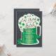Fun St. Patrick's Day dinner party invitation featuring a overflowing mug of green beer adorned with shamrocks set on a black chalkboard background. Easy to customise with your St. Patricks party information.