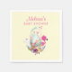Baby Shower paper napkins with a cute watercolor painting of a pale green egg sitting inside a wicker basket. Decorated with ribbons, bows, flowers and little hearts. A pink flamingo and white bunny rabbit by its side.