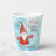 Create unique personalised Christmas paper cups for your family party with an elegant design that features a Merry Christmas saying, cheerful gnome in red and text templates for the year and Family name. These light blue and red paper cups with snowy pattern are perfect for winter holidays.