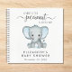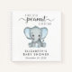 Cute guest book for your baby boy shower with "A Sweet Little Peanut Is On His Way" written in a mixture of soft grey typography and a stylish script, and a pastel blue watercolor of a baby elephant. Personalise the mother-to-be's name and the shower date in simple grey typography.
