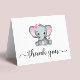 Cute folded thank you card for your baby girl shower with "thank you" in a stylish soft grey script with swashes and a pink watercolor of baby elephant. Inside, personalise your thank you message in simple grey topography or leave blank for a handwritten note.