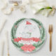 This cute White Elephant paper plate design features a watercolor elephant peeking out from a Christmas wreath. The words "Baby's First" are written in white on a red ribbon banner with Christmas directly below.