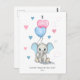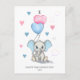 Cute and adorable baby boy elephant cartoon holding two heart shaped balloons in blue and pink colour and sweet hearts in pink and blue around.