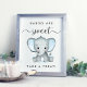 Cute sign for your baby boy shower with "Babies Are Sweet, Take A Treat" written in a mix of simple soft grey typography and a stylish script with swashes and a pastel blue watercolor of a baby elephant.