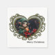 Cute Elf Child in Green Hooded Coat with Christmas Ornament – Magical Fantasy Holiday Design. A cute elf child with big eyes and pointy ears wears a green fur-trimmed hooded coat and holds a glowing orange Christmas ornament. Surrounded by gift boxes with red ribbons, pine branches, and berries, this magical holiday scene feels both festive and mystical. The dark ornate frame with a view into an enchanted forest makes this design perfect for fantasy lovers, Christmas fans, and magical holiday art.
