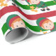 Wrapping paper featuring a cute elf pattern against a red and green stripes background. Perfect for Christmas celebrations.