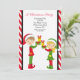 This is an adorable Christmas party invitation. It has a red and white striped background. Then there's a black thin border with a white centre. There's this cute girl elf holding up a present. Next to her is this cute elf decorating also holding presents up in his hand. The elves are dressed in red and green wearing santa hats. Personalise with party information above them. Check out the many other designs and products we have in Christmas invitations. © JW Illustrations