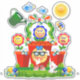 Cute colorful flowers with emoji faces, shining sun a butterfly, and bluebirds, plus a watering can giving those cheery flowers