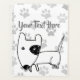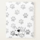 Cute little English Bull Terrier, white with black eye patch, over a background of grayscale paw prints...classical!