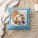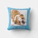 Cute English Bulldog Snowflake Christmas Dog Photo Throw Pillow. Blue background with white snowflakes. Photo of a British bulldog puppy and dog`s name. Insert your favourite photo into the template and personalise it with your name. Fun and festive pillow for a dog or any other pet.