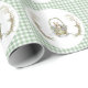 Charming and delicate baby shower gift wrap featuring a soft pastel palette with a green gingham frame. The design incorporates sweet illustrations of fairytale accents in sweeping greens and vines. The design also has soft hues of blue blush pink, sage green. Whimsical flowers and greenery surrounds the sweet animal graphic giving it an elegant yet playful touch. Perfect for welcoming any gender baby.