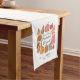 A cute illustration of pumpkins with the phrase "Thankful Grateful Blessed" accents this table runner. It is personalised with a name and established date.