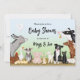 Down on the farm all the animals are super excited to welcome a new arrival! This cute personalized baby shower invitation features a donkey, a goose, a hen and her chicks, a baby goat, a piglet , a rabbit, two lambs, a border collie, a black cat and a cow and her calf.