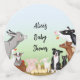 Celebrate a baby shower, baptism, christening or naming ceremony in style with this cute farm animal friends table confetti. Featuring a donkey, a goose, a hen and her chicks, a baby goat, a piglet, a rabbit, two lambs, a border collie, a black cat and a cow and her calf, the confetti can be personalized however you like.