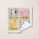 This playful wash cloth features a quartet of classic farm animals—a cow, a pig, a chicken, and a sheep—each set against a colourful, textured gingham background.