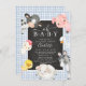 Adorable barnyard animals design featuring the sweetest cow, horse, pig, roaster, duck, baby chick & sheep set on a blue gingham background. Flip our card over to view a special surprise with our cute farm friends. Visit our shop to view our entire cute barnyard friends collection for neutral, girls or boys baby shower.