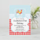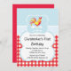 Start your kids barnyard animals birthday party off right with our sweet farm animals kids birthday invitation featuring a roaster set on a red gingham & blue background. Cute for a first girls birthday party or first boys birthday party. Visit our shop to view other cute farm barn yard animals birthday party invitations & matching thank you notes, stickers & postage stamps. © Babystar designs