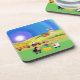 Kid's will love this adorable cartoon design with little cute farmyard animals! This plastic coaster features a hen and her baby chicks fighting over a worm, a tractor full of hay, and a farmer delivering hay to his two little black and white sheep. Perfect for little kids to keep their drinks on.