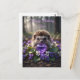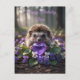 A cute hedgehog holding a purple amethyst heart sits in a patch of violets in a serene forest.