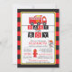 Modern & cute baby shower invitation featuring a red fire truck with a sweet dalmatian puppy dog set on a red & black stripe background with a fire hydrant accent. Flip our invitation over to view a matching back for an extra special touch. Perfect invite for a fireman / firetruck themed baby shower invitation