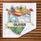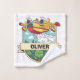 This personalised boys' wash cloth features a cute yellow and red firefighting aeroplane spraying water over a happy forest with cheerful trees and clouds.