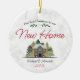 Cute first Christmas in our new home monogram ceramic ornament. Celebrate your first Christmas in your new beautiful home with a cute custom holiday ornament featuring a small cute house surrounded by green Christmas trees. Personalise it by changing the year and your family name.