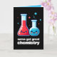 This design features the customisable quote "we've got great chemistry" rendered below a smiling beaker and test tube. Reverse shows identical design.