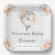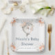 Beautiful baby shower plate features a dolphin with coral pink floral arrangements. Perfect for a baby shower. The words can be changed to suit your own details or requirements