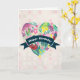 A Happy Birthday greeting card. An illustrated heart filled with flowers and leaves in pink, green and yellow colours. A blue green ribbon is layered over top and has the text "Happy Birthday" inside.