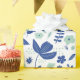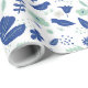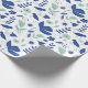 Modern floral wrapping paper in tones of oxford blue and mint green with beige accents depicting a spring garden complete with tulips and birdies.
